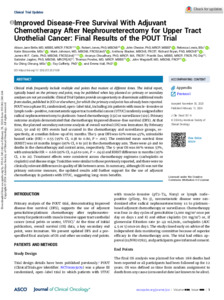 Birtle, Alison Jane, Jones, Robert, Chester, John, Lewis, Rebecca, Biscombe, Katie, Johnson, Mark, Blacker, Anthony, Bryan, Richard, Catto, James W.F. et al (2024) Improved Disease-Free Survival With Adjuvant Chemotherapy After Nephroureterectomy for Upper Tract Urothelial Cancer: Final Results of the POUT Trial. Journal of Clinical Oncology, 42 (13). ISSN 0732-183X