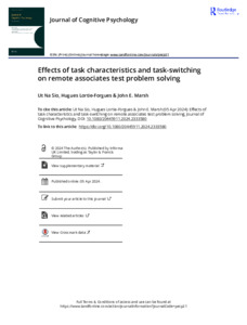Sio, Ut Na, Lortie-Forgues, Hugues and Marsh, John Everett orcid iconORCID: 0000-0002-9494-1287 (2024) Effects of Task Characteristics and Task-Switching on Remote Associates Test Problem Solving. Journal of Cognitive Psychology, 36 (5). pp. 595-616. ISSN 2044-5911