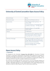 As illustrated by the University’s Strategic Plan 2021-2028 the University of Central Lancashire is committed to delivering an environment which supports the production of accessible knowledge and information to realise impacts of relevance to society. UCLan supports the principles of Open Access and is committed to increasing the visibility, use and impact of UCLan research as rapidly and effectively as practicable