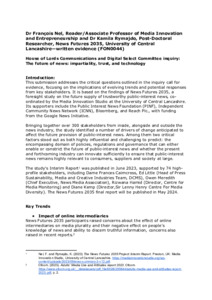 This abstract synthesises the submission to the House of Lords Communications and Digital Select Committee Inquiry into The Future of News, contributed by Dr François Nel and Dr Kamila Rymajdo of the University of Central Lancashire. Based on the comprehensive findings from the News Futures 2035 study, the submission tackles the pivotal issues concerning the future of trustworthy public-interest news, highlighting the significant impact of impartiality, trust, and technological advancements on the media sector.