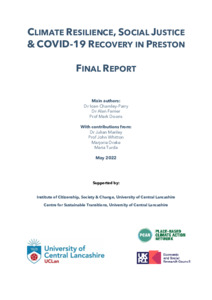 This document reports on the ‘Climate Resilience, Social Justice & COVID-19 Recovery in Preston’ project. Funded by the Place-Based Climate Action Network (PCAN) with additional support from the University of Central Lancashire (UCLan)’s Institute of Citizenship, Society & Change and Centre for Sustainable Transitions, this comprised a rapid literature review (supported by a webinar and workshop) and a qualitative research project. The project sought to explore how recovery from COVID-19 could create innovative opportunities for climate action and social justice, translating into practice the rhetoric of ‘build back better’ and serving as a springboard to accelerate action for a future that respects and prioritises the wellbeing of people, places and the planet.