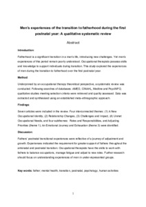 Fatherhood is a significant transition in a man’s life, introducing new challenges. Yet men’s experiences of this period remain poorly understood. Occupational therapists possess skills and knowledge to support individuals during transition. This study explored the experiences of men during the transition to fatherhood over the first postnatal year.