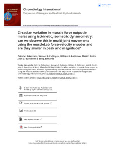 Robertson, Colin, Pullinger, Samuel A., Robinson, William R., Smith, Matt E., Burniston, Jatin G. and Edwards, Ben J. (2024) Circadian variation in muscle force output in males using isokinetic, isometric dynamometry: can we observe this in multi-joint movements using the muscleLab force-velocity encoder and are they similar in peak and magnitude? Chronobiology International: The Journal of Biological and Medical Rhythm Research, 41 (5). pp. 709-724. ISSN 0742-0528