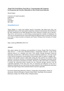 This article explores the challenges and possibilities of writing ‘People Who Want History Want History’ – a short story structured around a ‘reminiscence interview’ as part of the induction process in a dementia care home. Told entirely through documents (interview transcripts, excerpts from a staff manual, care home marketing material etc.), the story avoids a fixed narrative perspective, leaving plenty of hermeneutic gaps for readers to grapple with. I reflect on the specific choices I made while writing this story and the way I aimed to draw attention to the power structures of institutional landscapes, the damaging stereotypes around dementia, and narrative expectations of readers. Drawing on other short stories as inspiration, I consider the interesting echoes between the way dementia disrupts narrative, and the suspended temporality of the short story form. In examining and reflecting on this story I attempt to illuminate the way short fiction can draw attention to the troubling and multivalent stories that might emerge when sustained narrative becomes impossible.