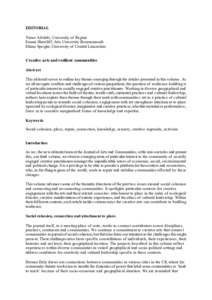 This editorial serves to outline key themes emerging through the articles presented in this volume. As we all navigate conflicts and challenges of various proportions, the question of resilience-building is of particular interest to socially engaged creative practitioners. Working in diverse geographical and virtual locations across the fields of theatre, textile craft, curatorial practices and cultural leadership, authors here explore these themes through their work with communities: art as a practice of cultural leadership points us towards social cohesion; engagement with art strengthens attachment to place uprooted by ecological disaster; imaginative and creative practices, whether material or performative, force us to consider marginalized forms of knowledge and expertise.