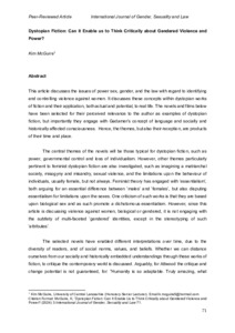 This article discusses the issues of power sex, gender, and the law with regard to identifying and controlling violence against women. It discusses these concepts within dystopian works of fiction and their application, both actual and potential, to real life. The novels and films below have been selected for their perceived relevance to the author as examples of dystopian fiction, but importantly they engage with Gadamer’s concept of language and socially and historically affected consciousness. Hence, the themes, but also their reception, are products of their time and place.