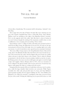 Nonfiction chapter exploring signs of climate change at Everest Base Camp, the history of the camp and reflecting on personal links to these issues.