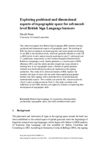 This study investigates how British Sign Language (BSL) learners develop positional and dimensional aspects of topographic space. The teaching of BSL has been occurring at an increasing rate, and many people are learning to use BSL to the advanced levels, which are generally referred to in the UK as BSL Levels 4 and 6 and are loosely equivalent to pre-C1 (advanced) and C1 (proficient), respectively, on the Common European Framework for Reference (Languages) scale. Spatial grammar is a crucial aspect of BSL (Brennan 1992), and this article provides insight into issues related to learning how to use topographic space, a feature of spatial grammar whereby real-world referent locations are replicated in the signing production. This study of L2 advanced learners of BSL explores the numbers and types of errors that are made when applying topographic features into their signing, with a particular focus on positioning and dimensionality aspects. Two scenarios are used do this: classroom layouts (Task 1) and a courtroom layout (Task 2). The study concludes with reflections on how BSL teachers can support L2 learners in improving their development of topographic skills.