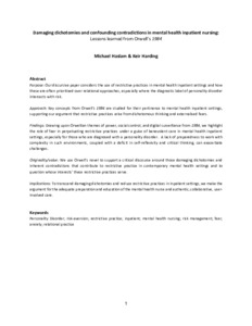 Implications: To transcend damaging dichotomies and reduce restrictive practices in inpatient settings, we make the argument for the adequate preparation and education of the mental health nurse and authentic, collaborative, user-involved care.