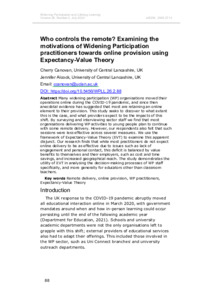 Canovan, Cherry orcid iconORCID: 0000-0002-9751-5646 and Alcock, Jennifer orcid iconORCID: 0000-0002-1026-6545 (2024) Who controls the remote? Examining the motivations of WP practitioners towards online provision using Expectancy-Value Theory. Widening Participation and Lifelong Learning, 26 (2). pp. 88-114. ISSN 1466-6529