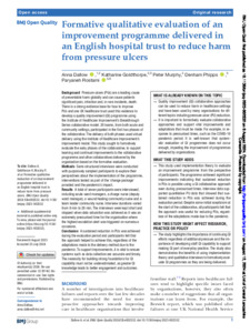Dallow, Anna, Goldthorpe, Katharine, Murphy, Peter, Phipps, Denham and Rostami, Paryaneh (2024) Formative qualitative evaluation of an improvement programme delivered in an English hospital trust to reduce harm from pressure ulcers. BMJ Open Quality, 13 (3). e002532.