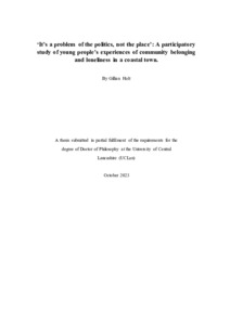 Holt, Gillian Helen (2024) ‘It’s a problem of the politics, not the place’: A participatory study of young people’s experiences of community belonging and loneliness in a coastal town. Doctoral thesis, University of Central Lancashire.