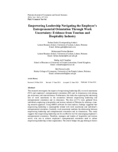 This research investigates the impacts of empowering leadership (EL) on work uncertainty (WU) and employee’s entrepreneurial orientation (EO) and its dimensions (risk-taking, pro-activeness, and innovativeness). Furthermore, this study also exploring the intervening role of work uncertainty in the connection between empowering leadership and entrepreneurial orientation and its dimension. The data (n=271) were gathered from individuals employing in hospitality and tourism industry of Pakistan by utilizing a time-lag research approach. Using AMOS software for data analysis, findings suggested that empowering leadership is meaningfully related with work uncertainty and individual’s entrepreneurial orientation. Similarly, work uncertainty mediates the relationship between empowering leadership and entrepreneurial orientation and its dimensions. This study suggests that empowering leadership can be an effective tool for encouraging employee’s entrepreneurial orientation. Therefore, managers and leaders of hospitality and tourism sector, who aim to achieve employee’s entrepreneurial orientation need to induce empowering leadership in their organization. The article bridges the gap relating to factors