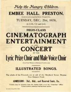 Shepherd Street Mission, SSM (1909) Flyer for entertainment and concert, Embee Hall, Preston [SSM23_21]. Other. UNSPECIFIED.