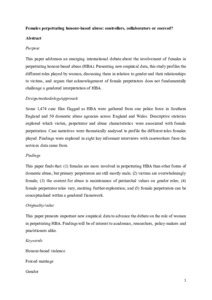 This paper finds that: females are more involved in perpetrating HBA than other forms of domestic abuse, but primary perpetrators are still mostly male; victims are overwhelmingly female; the context for abuse is the maintenance of patriarchal values on gender roles; female perpetrator roles vary, meriting further exploration; and female perpetrators can be conceptualised within a gendered framework.