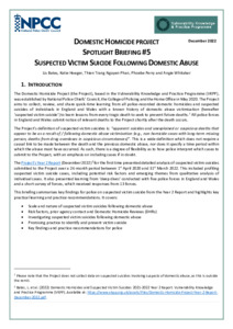 Bates, Lis orcid iconORCID: 0000-0002-2425-7201, Hoeger, Katie, Nguyen Phan, Thien Trang, Perry, Phoebe and Whitaker, Angie (2022) DOMESTIC HOMICIDE PROJECT SPOTLIGHTBRIEFING #5 SUSPECTED VICTIM SUICIDE FOLLOWING DOMESTIC ABUSE. Project Report. Vulnerability Knowledge & Practice Programme (VKPP).