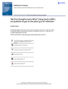 Reflection and reflective practice continue to be crucial elements of teaching, learning and development in health and care professions and can be used to identify elements of self, including values and experience, which impact the care we deliver. Whilst students grasp that reflection is a task they need to carry out, they rarely consider the philosophical underpinning of what reflection is for and, may not realise that reflective thinking is a step beyond simply writing about an experience. Using Saul’s notion of the Six Qualities which