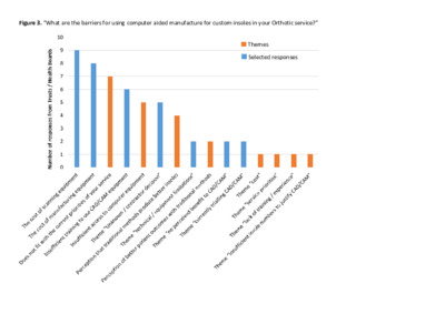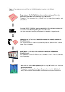 Conclusions: UK orthotic services have widely adopted CAD/CAM insole production, but fully-digital workflow is uncommon. Hybrid-digital workflow involves physical casts and their transportation, generating waste and impacting sustainability. Further research is required to understand how hybrid-digital and fully-digital workflow affect patient treatment outcomes, costs and sustainability. Barriers to CAD/CAM including costs and staff training which should be considered alongside the growing body of research around CAD/CAM technologies.