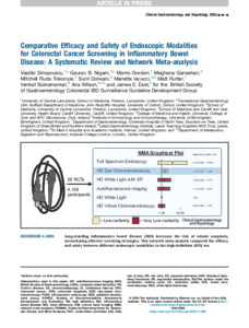 Sinopoulou, Vasiliki orcid iconORCID: 0000-0002-2831-9406, Nigam, Gaurav B., Gordon, Morris orcid iconORCID: 0000-0002-1216-5158, Ganeshan, Meghana, Tokonyai, Mitchell Rudo, Dolwani, Sunil, Iacucci, Marietta, Rutter, Matt, Subramanian, Venkat et al (2024) Comparative Efficacy and Safety of Endoscopic Modalities for Colorectal Cancer Screening in Inflammatory Bowel Disease: A Systematic Review and Network Meta-Analysis. Clinical Gastroenterology and Hepatology (CGH) . ISSN 1542-3565 (In Press)