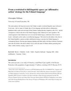 Williams, Christopher (2013) From a restricted to full linguistic space: an ‘affirmative action’ strategy for the Udmurt language. Pragmatics and Society, 4 (2). pp. 221-239. ISSN 1878-9722