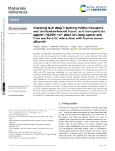 Singh, Snigdha, Sewariya, Shubham, Goel, Tanya, Panchal, Sagar, Singh, Aarushi, Kukreti, Shrikant, Tiwari, Manisha and Chandra, Ramesh (2025) Assessing the Dual Drug 9-hydroxymethyl Noscapine and Telmisartan-loaded Stearic Acid Nanoparticles against (H1299) non-small cell lung cancer and its mechanistic interaction with Bovine Serum Albumin. Materials Advances, 4 . pp. 1364-1378.