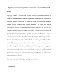This study employs a computational method, together with qualitative analysis, to explore the metapragmatics of politeness lexemes that both scholars and laypersons fail to provide effective articulations for. We specifically choose two bewildering politeness lexemes – kyemson (‘modesty’) and kongson (‘politeness’) – in Korean, and use the computational approach to identify their metapragmatic differences by analyzing over 27,000 texts that feature their usage. Results show that, while kyemson is associated with speakers’ personal and interpersonal qualities, kongson is manifested in a range of normative semiotic practices. They both feature the concepts of lowering oneself and elevating others, but realize them at different levels. In addition, kyemson helps to achieve relational harmony regardless of social hierarchies, and kongson reinforces social hierarchies but speaks little of relational harmony. The findings make two important contributions – namely, providing a novel methodology to address the pitfall in analysing first-order and second-order politeness, and offering an insight into the underexplored politeness lexemes in Korean.