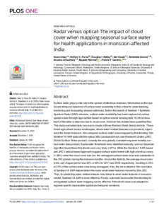 Surface water plays a vital role in the spread of infectious diseases. Information on the spatial and temporal dynamics of surface water availability is thus critical to understanding, monitoring and forecasting disease outbreaks. Before the launch of Sentinel-1 Synthetic Aperture Radar (SAR) missions, surface water availability has been captured at various spatial scales through approaches based on optical remote sensing data. A critical drawback of the latter is data loss due to cloud cover, however few studies have quantified this. This study evaluated data loss due to clouds in three Western Ghats (India) districts. These forest-agricultural mosaic landscapes, where water-related diseases are prevalent, experience the Indian monsoon. We compared surface water areas mapped by thresholding 10m Sentinel-1A SAR data with the optical 30m Landsat-derived Joint Research Centre (JRC) Global Surface Water product, currently the only globally available long-term monthly surface water data product. Backscatter thresholds were identified manually, and our Bayesian algorithm found these thresholds were very likely (>97%). While the Sentinel-1 SAR-based and JRC’s optical-based approach mapped surface water extent with high overall accuracy (> 98%) when the cloud cover was low, the unmapped surface water area was substantial in the JRC product during the monsoon months. Across the districts, the average cloud cover in the July-August period was 92% or 90% for 2017 and 2018 respectively, resulting in 25% or 23% of the surface water area being unmapped. Also, the more detailed 10m resolution of Sentinel-1A SAR helped detect the many small water features missed by 30m JRC. Thus, for predicting water-related disease risks linked to small water features or monsoon rainfall, Sentinel-1A SAR is more effective. Finally, automatic backscatter thresholding for unvegetated surface water mapping can be effective if threshold values are adapted to regional-specific backscatter spatial and temporal variations.