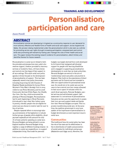 Personalisation services are developing in England as a social policy response to user demands for more tailored, effective and flexible forms of health and social care support. Across England and Wales, this process is being implemented under the personalization which is also seen as a vehicle for promoting service user rights through increasing participation, empowerment and control while also promoting self-restraint by having users manage the costs of their health and social care. This paper reviews the existing research evidence for personalization, albeit limited, and identifies themes for future research.