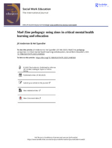 This article explores how zines might be used as a medium for generating and communicating alternative forms of Mad-centred knowledge in diverse learning contexts. It draws on our research project about ‘madzines’ which involved identifying madzines; ‘being with’ them; sharing examples with others, and facilitating madzine workshops across both formal and informal settings. Here, we use these activities to reflect on the possibilities, as well as the limitations, of using these informal DIY publications as a form of critical mental health learning, focusing on social work education. Drawing on Alison Piepmeier’s idea of zines as pedagogies of hope, we explore how using madzines in teaching might help: enable learners to: process alternative knowledge and understanding; actively critique existing services and the policy that informs them; and imagine alternatives. We also identify several limitations to be aware of when introducing zines in formal educational settings: decontextualisation, unethical sharing, the othering of madness; and instrumentalising zines. We suggest that our reflections have wider applications across professional, and indeed non-professional, settings.