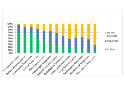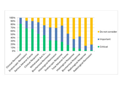 A Delphi methodology was used to develop a consensus. An online survey was conducted by inviting stakeholders from the British Society of Gastroenterology (BSG) through a two-phase process. Participants were asked to select important clinically relevant outcomes and were asked about what magnitude of the effect they consider large, moderate, small, or trivial for each clinical trial outcome in line with the GRADE guidance. The results were fedback to all participants to ensure consensus agreement. Then, further surveys were sent to Europe and North America to ensure validity and international triangulation of the data set. Data are presented as mean percentages with standard deviation (SD).