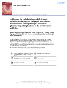 Ashinze, Patrick, Karkhanis, Simran Sachin, Oki, Babas Puamus, Ngirigwa, Chibueze Francis, Olaniyan, Matthew Olamide, Oluyole, Aishat, Olatunji, Samuel and Aminu, Aliyu Mansa (2025) Addressing the global challenge of Helicobacter pylori -induced dyspepsia and peptic ulcer disease: socioeconomic, clinicopathologic, and clinico-pharmacological implications of the new treatment guidelines. Gut Microbes Reports, 2 (1). pp. 1-6.