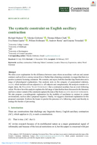 Hudson, Richard, Gisborne, Nikolas, Clark, Thomas Hikaru, Eppler, Eva Duran, Hollmann, Willem, Rosta, And and Trousdale, Graeme (2025) The syntactic constraint on English auxiliary contraction. Journal of Linguistics . ISSN 0022-2267