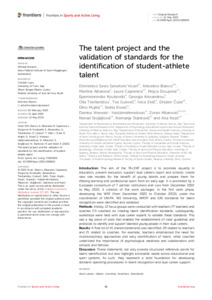 Vicari, Domenico Savio Salvatore, Bianco, Antonino, Albanese, Martina, Capranica, Laura, Doupona, Mojca, Koutavelis, Epameinondas, Alexandrou, Georgia, Tsivitanidou, Olia, Gutović, Tea et al (2025) The Talent Project and the validation of standards for the identification of student-athlete talent. Frontiers in Sports and Active Living, 7 .