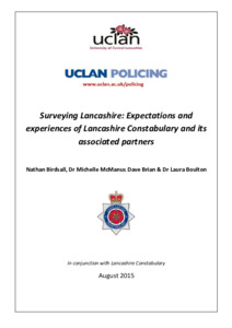 Birdsall, Nathan orcid iconORCID: 0000-0002-7253-9211, Mcmanus, Michelle Ann orcid iconORCID: 0000-0002-0095-1071, Brian, David John orcid iconORCID: 0000-0002-7518-7848 and Boulton, Laura orcid iconORCID: 0000-0001-5623-8884 (2015) Surveying Lancashire: Expectations and experiences of Lancashire Constabulary and its associated partners. Project Report. University of Central Lancashire, Preston. (Unpublished)