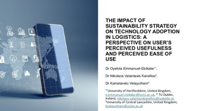 Emmanuel-Ebibake, Oyetola, Kanellos, Nikolaos Valantasis and Velayutham, Kamalavelu (2024) THE IMPACT OF SUSTAINABILITY STRATEGY ON TECHNOLOGY ADOPTION IN LOGISTICS: A PERSPECTIVE ON USER’S PERCEIVED USEFULNESS AND PERCEIVED EASE OF USE. In: UNSPECIFIED.