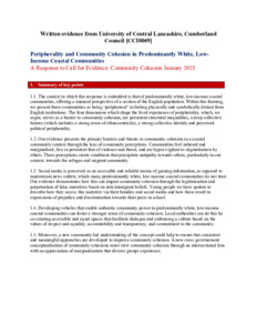 1.1. The context in which this response is embedded is that of predominantly white, low-income coastal communities, offering a nuanced perspective of a section of the English population. Within this framing, we present these communities as being ‘peripherical’ in feeling physically and symbolically distant from English institutions. The four dimensions which shape the lived experience of peripherality, which, we argue, serves as a barrier to community cohesion, are persistent structural inequalities, a deep collective history (which includes a strong sense of ethnocentricity), a strong collective identity and perceived political peripherality.