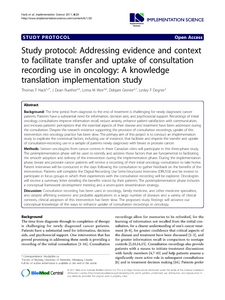 Consultation recording has been used in oncology, family medicine, and other medicine specialties, and despite affirming evidence and probable applications to a large number of diseases and a variety of clinical contexts, clinical adoption of this intervention has been slow. The proposed study findings will advance our conceptual knowledge of the ways to enhance uptake of consultation recordings in oncology.