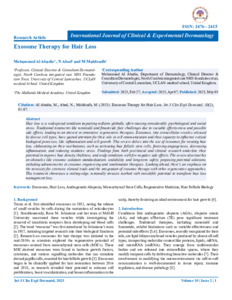 Al Abadie, Mohammed, Abed, N and Mahfoudh, M (2025) Exosome Therapy for Hair Loss. International Journal of Clinical & Experimental Dermatology (IJCED), 10 (02). 01-07. ISSN 2476-2415