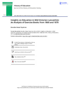 This article analyses two exercise books from the mid-Victorian period that once belonged to a pupil teacher named Joseph Prescott, who taught at St Mary’s School, a Catholic educational institution in Chorley, England. The exercise books act as a case study for curriculum structure and educational practice in Lancashire by highlighting several themes, including the role of religion in the Victorian school day. After addressing the deficiencies in accessing education in the Victorian period, the article contextualises the analysis of the exercise books by recounting the development of the pupil-teacher system in Britain. Key pages of the exercise books reflect the Catholic nature of the curriculum at St Mary’s School and show that educators of the period taught a range of subjects. The article addresses the role of the pupil-teacher system in mid-Victorian schooling, leading to a clearer understanding of the responsibilities and prospects of pupil teachers during the period.