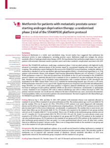 Gillessen, Silke, Murphy, Laura, James, Nicholas D, Sachdeva, Ashwin, El-Taji, Omar, Abdel-Aty, Hada, Adler, Amanda I, Amos, Claire, Attard, Gerhardt et al (2025) Metformin for patients with metastatic prostate cancer starting androgen deprivation therapy: a randomised phase 3 trial of the STAMPEDE platform protocol. The Lancet Oncology, 26 (8). pp. 1018-1030. ISSN 1470-2045