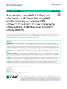 Jones, Steven H., Byford, Sarah, Coleman, Elizabeth, Creswell, Cathy, Cryle, Lucy, Duffy, Anne, Fortier, Stephanie, Hewitt, Catherine Elizabeth, Lobban, Fiona et al (2025) A randomised controlled clinical and cost effectiveness trial of an online integrated bipolar parenting intervention (IBPI) compared to treatment as usual in improving child emotional and behavioural outcomes: a study protocol. BMC Psychiatry, 25 . p. 816.