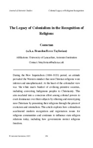 During the New Imperialism (1884–1920) period, an attitude pervaded the Western mindset that non-Christian religions were inferior and unsophisticated. At the heart of the colonialist view was ‘the white man’s burden’ of civilising primitive societies, including converting Indigenous peoples to Christianity. This aim escalated into a conscious effort among colonial powers to exert dominance over their subjects by othering and stereotyping non-Christians by presenting their religions through the prism of exoticism and orientalism. This article explores how colonialism accelerated modern recognition and registration issues for religious communities and continues to influence state-religion relations today, including how governments restrict religious freedom.