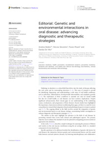 Ballini, Andrea, Silvestris, Nicola, Pisani, Flavio and De Vito, Danila (2025) Editorial: Genetic and environmental interactions in oral disease: advancing diagnostic and therapeutic strategies. Frontiers Media.