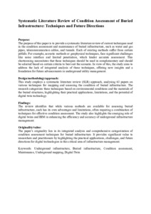 Purpose The purpose of this paper is to provide a systematic literature review of current techniques used in the condition assessment of buried infrastructure. Each of the existing methods suffers from certain pitfalls. For example, acoustic methods or geophysical techniques face significant challenges like noise interference and limited penetration, which hinder accurate assessment. This shortcoming necessitates that these techniques should be used in a complementary way and should be selected based on certain criteria to best suit the scenario. In view of this, the study aims to address the lack of integrated analysis of these techniques, offering new insights and a foundation for future advancements in underground utility management. Design/methodology/approach This study employs a systematic literature review (SLR) approach, analysing 64 papers on various techniques for mapping and assessing the condition of buried infrastructure. The research categorises these techniques based on environmental conditions and the materials of the buried structures, highlighting their practical applications, limitations, and the potential of digital twin technology. Findings The review identifies that while various methods are available for assessing buried infrastructure, each has its own advantages and limitations, often requiring a combination of techniques for effective condition assessment. The study also highlights the emerging role of digital twins and BIM in enhancing the efficiency and accuracy of underground infrastructure management. Originality/value The paper’s originality lies in its integrated analysis and comprehensive categorisation of condition assessment techniques for buried infrastructure. It provides significant value to researchers and practitioners by highlighting the practical applications, challenges, and future directions for digital technologies in this critical area of infrastructure management.