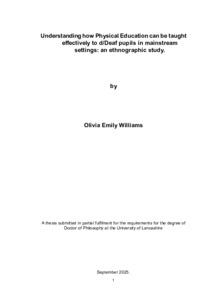Williams, Olivia (2025) Understanding how Physical Education can be taught effectively to d/Deaf pupils in mainstream settings: an ethnographic study. Doctoral thesis, University of Lancashire.