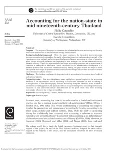 Design/methodology/approach – First, the paper examines the theoretical inter-relationship between accounting and nationalism. Second, it relates this theoretical understanding to a study of the changing concepts, methods and structures of indigenous Siamese accounting at a time of transition when foreign mercantile influence was beginning to have an impact on the mid nineteenth-century Siamese economy. Third, the paper analyses how these accounting structures and practices came to constitute a socio-political instrument, which contributed to the administrative development of a Siamese dynastic state by the mid nineteenth-century. Finally, the paper studies the ways in which this dynastic state began to promote national characteristics through the use of its accounts to create a sense of Siamese cultural identity.