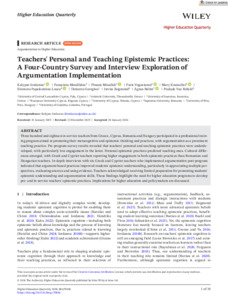 Three hundred and eighteen in-service teachers from Greece, Cyprus, Romania and Hungary participated in a professional training program aimed at promoting their metacognitive and epistemic thinking and practices, with argumentation as a prominent teaching practice. Pre-program survey results revealed that teachers' personal and teaching epistemic practices were underdeveloped, with particularly low engagement in the latter. Personal epistemic practices predicted teaching ones. Cultural differences emerged, with Greek and Cypriot teachers reporting higher engagement in both epistemic practices than Romanian and Hungarian teachers. In-depth interviews with six Greek and Cypriot teachers who implemented argumentation post-program indicated that argument-based practices improved students' epistemic understanding, particularly in appreciating multiple perspectives, evaluating sources and using evidence. Teachers acknowledged receiving limited preparation for promoting students' epistemic understanding and argumentation skills. These findings highlight the need for higher education programs to develop pre- and in-service teachers' epistemic practices. Implications for higher education and policymakers are discussed.