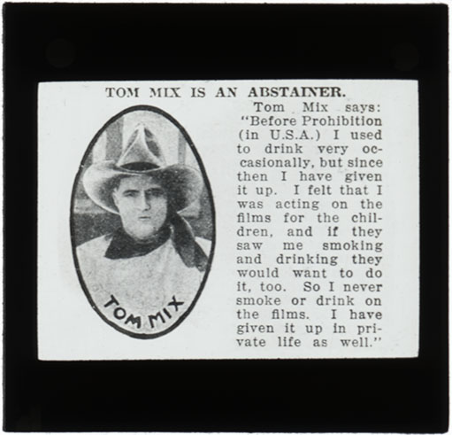 Lantern slide displaying the view on alcohol of actor Tom Mix.