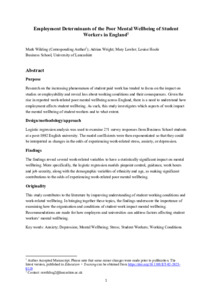Research on the increasing phenomenon of student paid work has tended to focus on the impact on studies or employability and reveal less about working conditions and their consequences. Given the rise in reported work-related poor mental wellbeing across England, there is a need to understand how employment affects student wellbeing. As such, this study investigates which aspects of work impact the mental wellbeing of student workers and to what extent.
