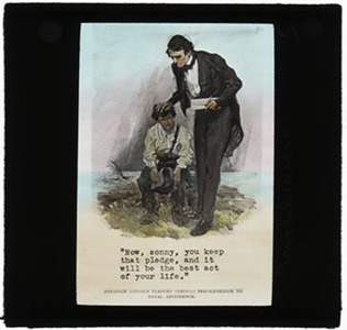 Lantern slide displaying American President Abraham Lincoln pledging Cleopas Breckenridge to total abstinence